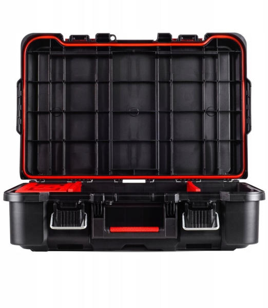 Szerszám rendszerező, kivehető elválasztók, minirendszerező a csomag része, fém reteszek a fedél erős lezárására, gumírozott fogantyú és oldalsó fogantyúk az egyszerű áthelyezéshez, a Stack'N'Roll moduláris rendszer része.