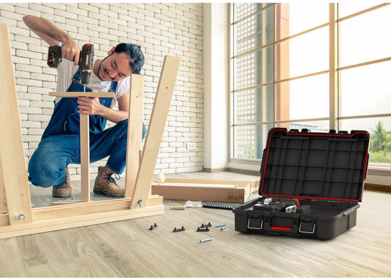 A fém reteszek a fedél erős lezárását biztosítják. A rendszerező tartalma így nem szóródik ki, és biztonságban marad. Ha azt szeretné, hogy a szerszámaihoz csak Ön jusson hozzá, hagyományosan lakatolja le. A lakatot külön kell megvásárolnia. A gumírozott fogantyú és az oldalsó fogantyúk ráadásul megkönnyítik a rendszerező áthelyezését.